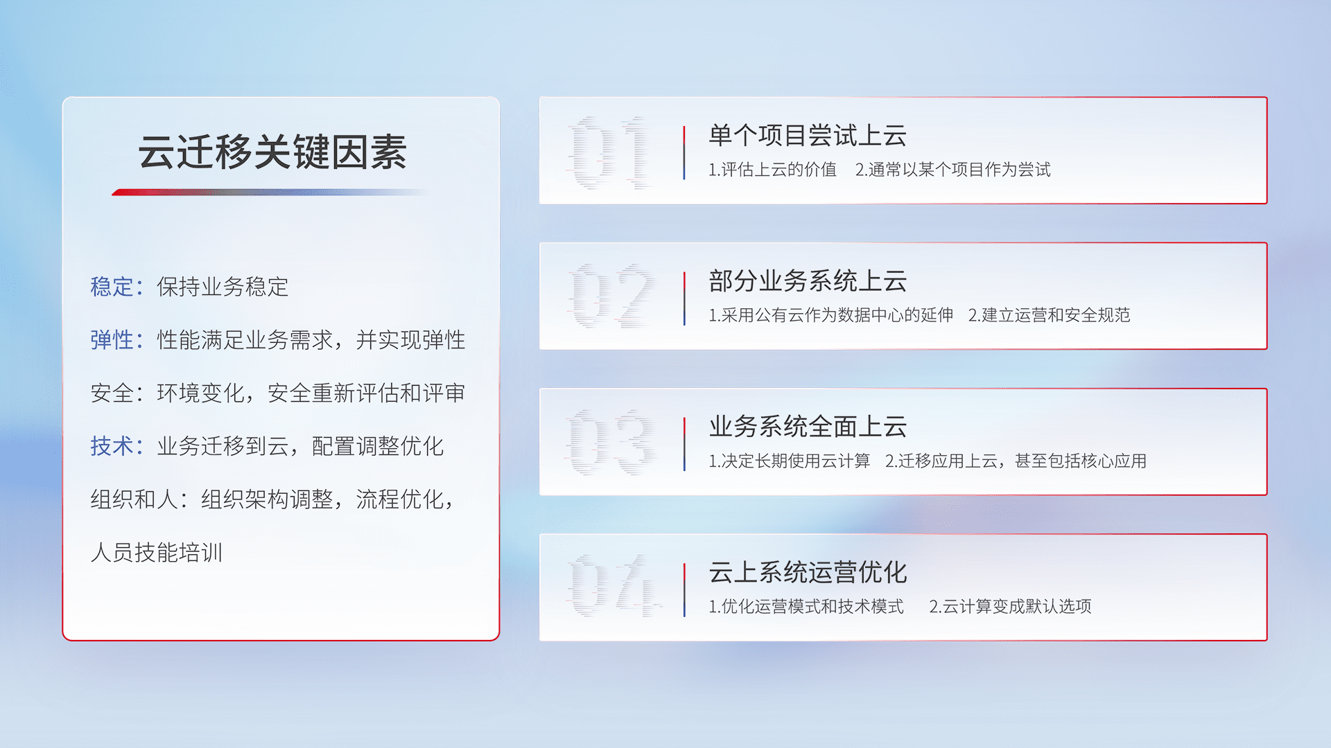 结合实际业务,,,从规划设计、、、、云平台选型、、、云原生改造、、、数据迁移、、、集成交付,,迁移全过程为客户识别最佳上云路径,,,,做好风险识别管理,,,设计网络架构、、身份权限、、、、安全审计合规、、、操作审计、、、、日志审计、、、、监控告警策略、、多站点容灾设计等,,,,对云上基础设施进行整体规划,,,,提升IT治理水平,,,以满足弹性、、、高可用、、、高性能的需求。。