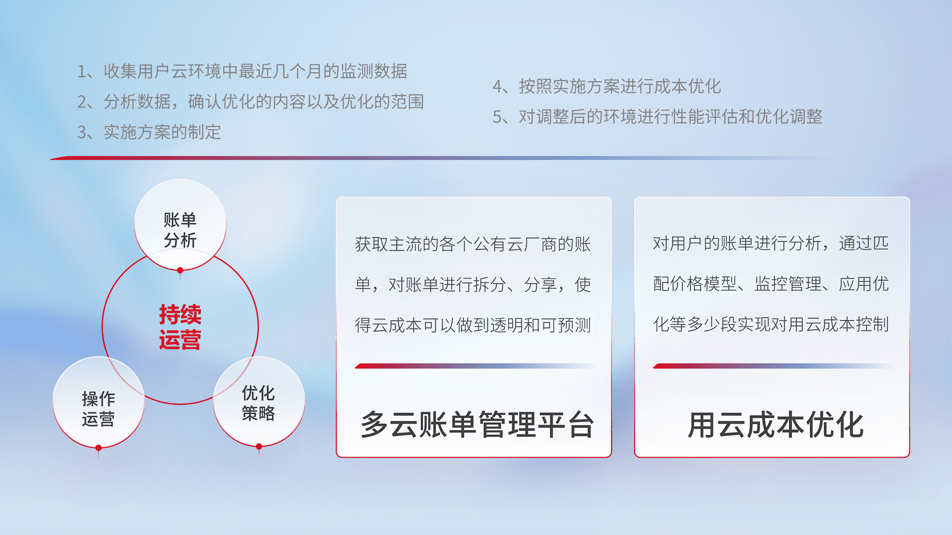 通过多云纳管,,,,以统一的资源数据模型把客户的云资源进行抽象和封装,,,进而实现对多云资源的统一操作,,保障云资源管理的可靠性、、、、稳定性与可用性。。量身定制化运维内容,,配置、、开发运维、、补丁管理、、、、备份、、、、监控、、、认证和访问管理、、审计和日常巡检等,,保障在用云过程中的可靠度,,稳定度以及高可用率。。。